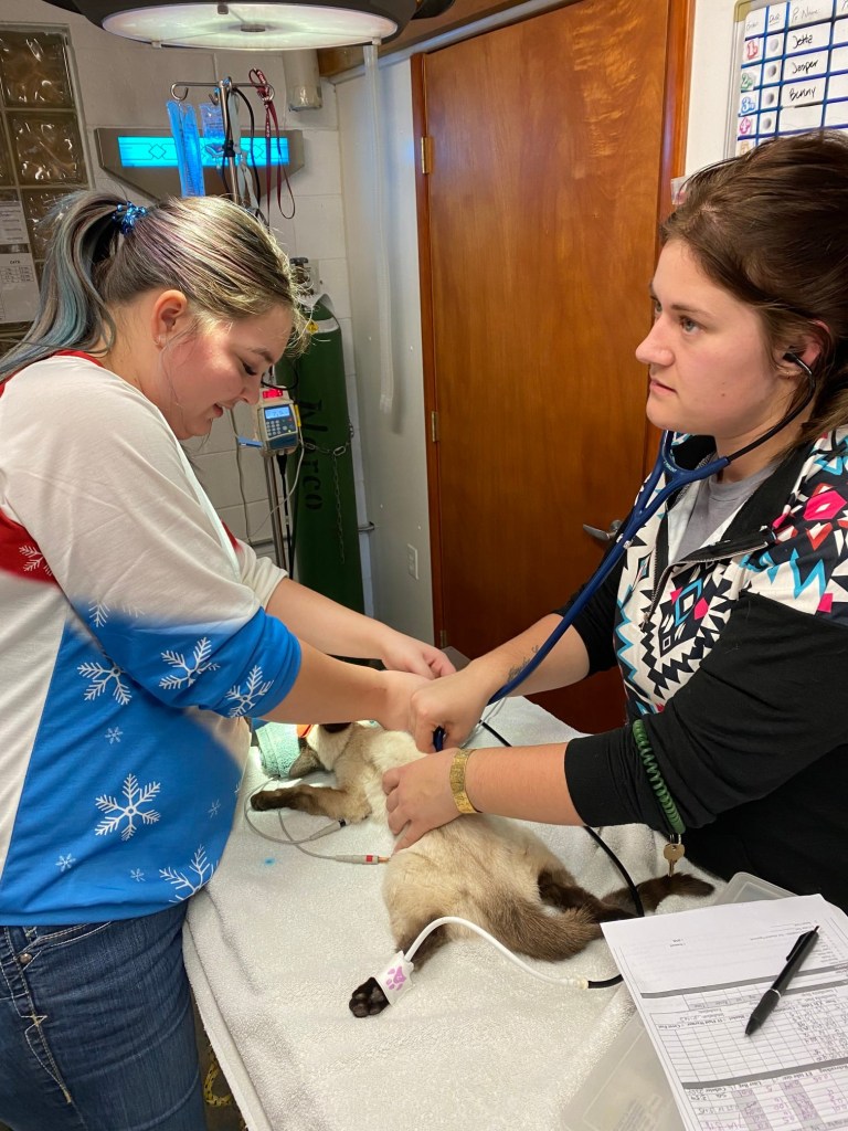 The next day, despite it being really busy, our surgical team led by Dr.Betsy got kitty prepped and ready for surgery (enucleate this!!!!) At one point we thought Dr.Chelsea would be doing the honors, then her clients showed up so then it was back on Dr.Betsy’s books. I had done the pre-surgical exam with my technician, Jessi first thing that morning.