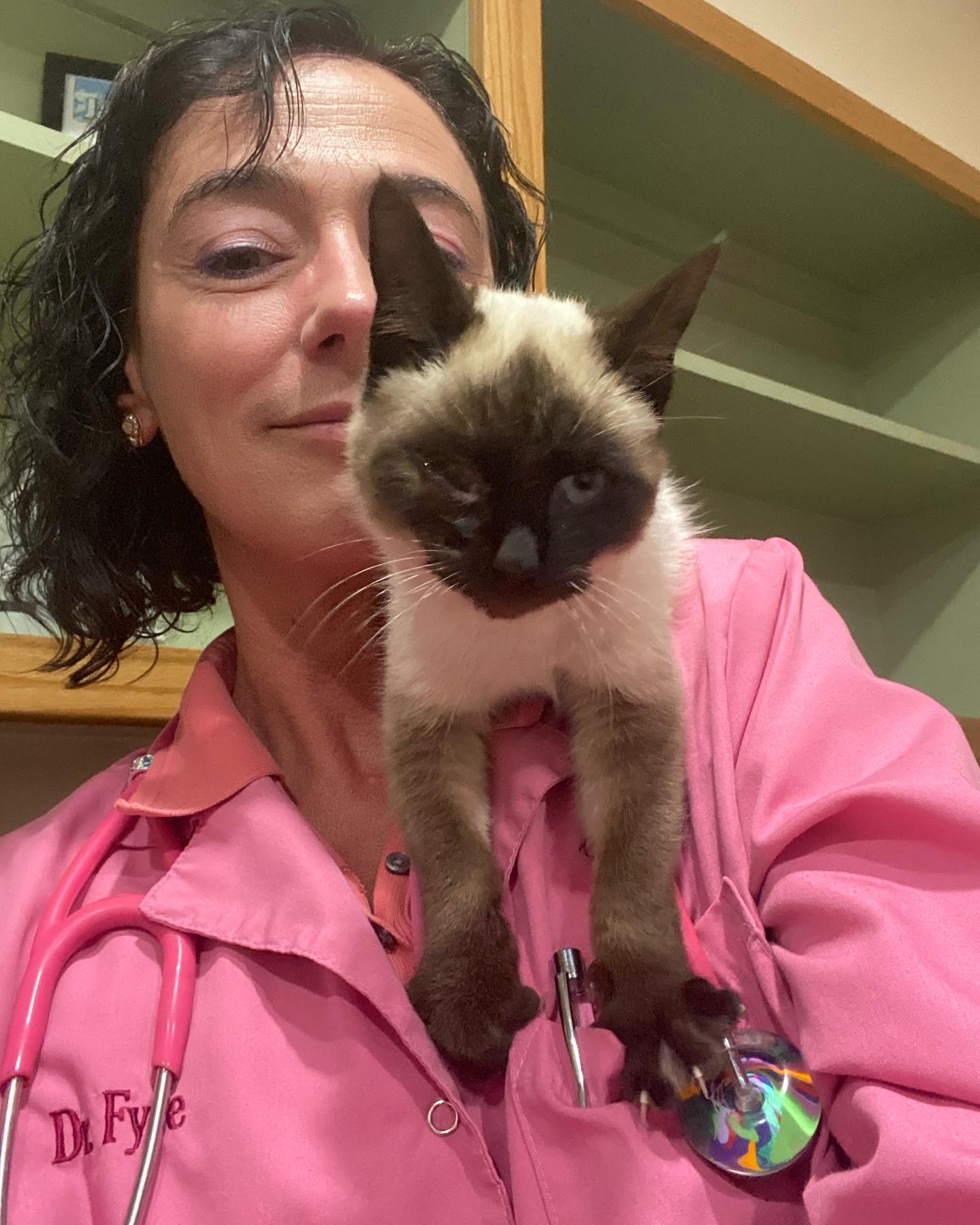 Kitty was very active that morning. Crawling all over us, the exam room, the counters… she climbed up onto my shoulders and thrust herself off my chest towards Jessi who, thankfully, has quick reflexes. She nested in Jessi’s hair, she tried to leap up onto the counters from the floor, she wriggled and wrestled me and my stethoscope and was just a general psycho.